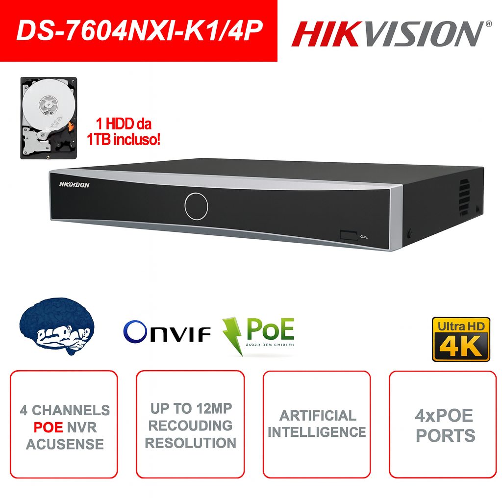 NVR  HIKVISION DS-7604NXI-K1/4P IP PoE ONVIF - 4 Canali IP - Fino a 12MP 4K ULTRA-HD - 4 porte PoE - Banda 40Mbps input / 80Mbps Output - Codec H.265+ - HDMI (4K), VGA (FullHD), 2 USB (2.0), fino a 1HDD SATA da 10TB (non incluso) 1HDD da 1TB incluso , 1 uscita audio, 1 canale audio bidirezionale, RJ-45 10/100/1000Mbps - Intelligenza artificiale: Rilevamento volto, protezione perimetro, Motion detection 2.0,  ANPR - 128 connessioni remote - Alimentazione 12 VDC, 1.5 A.